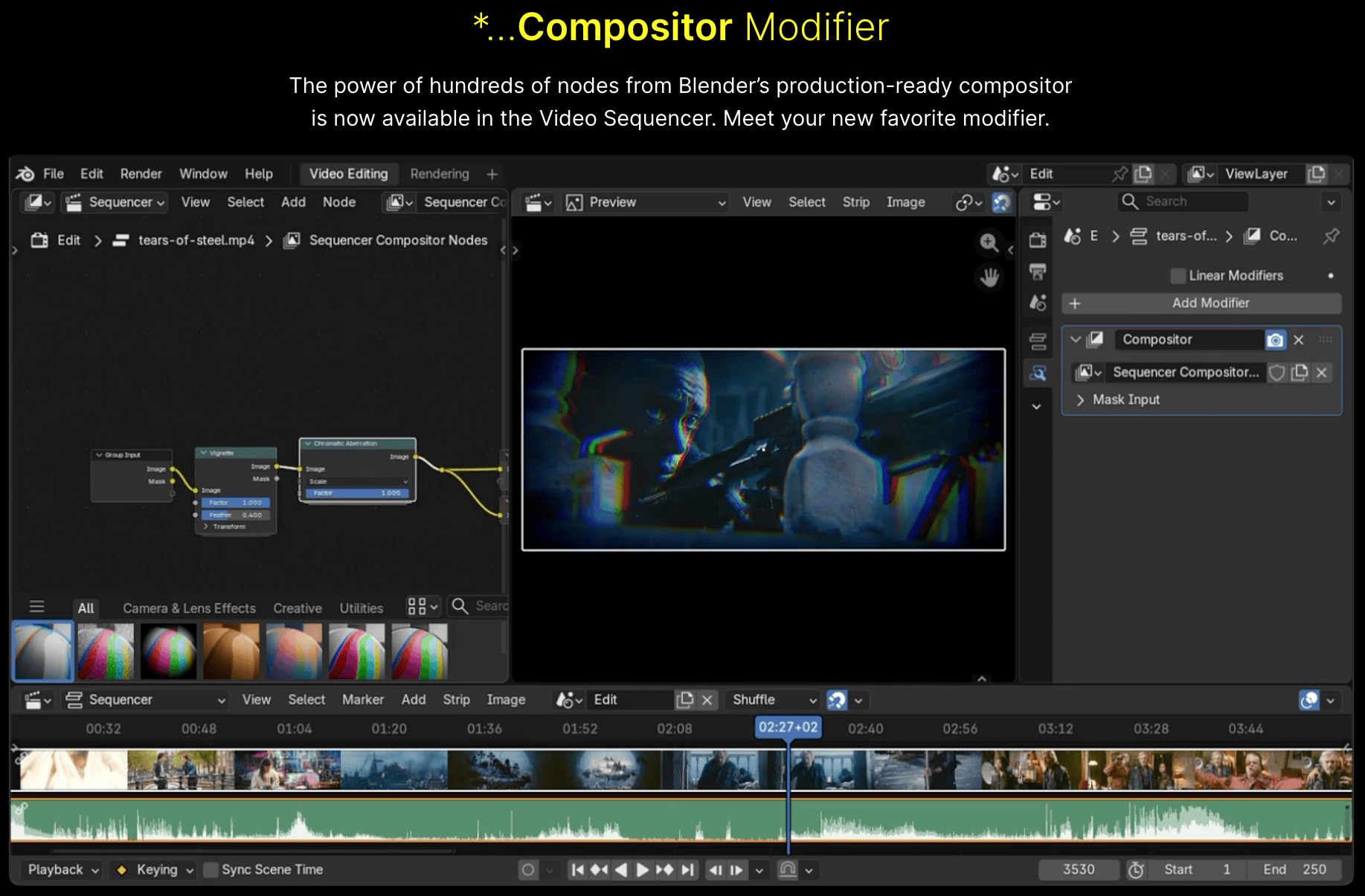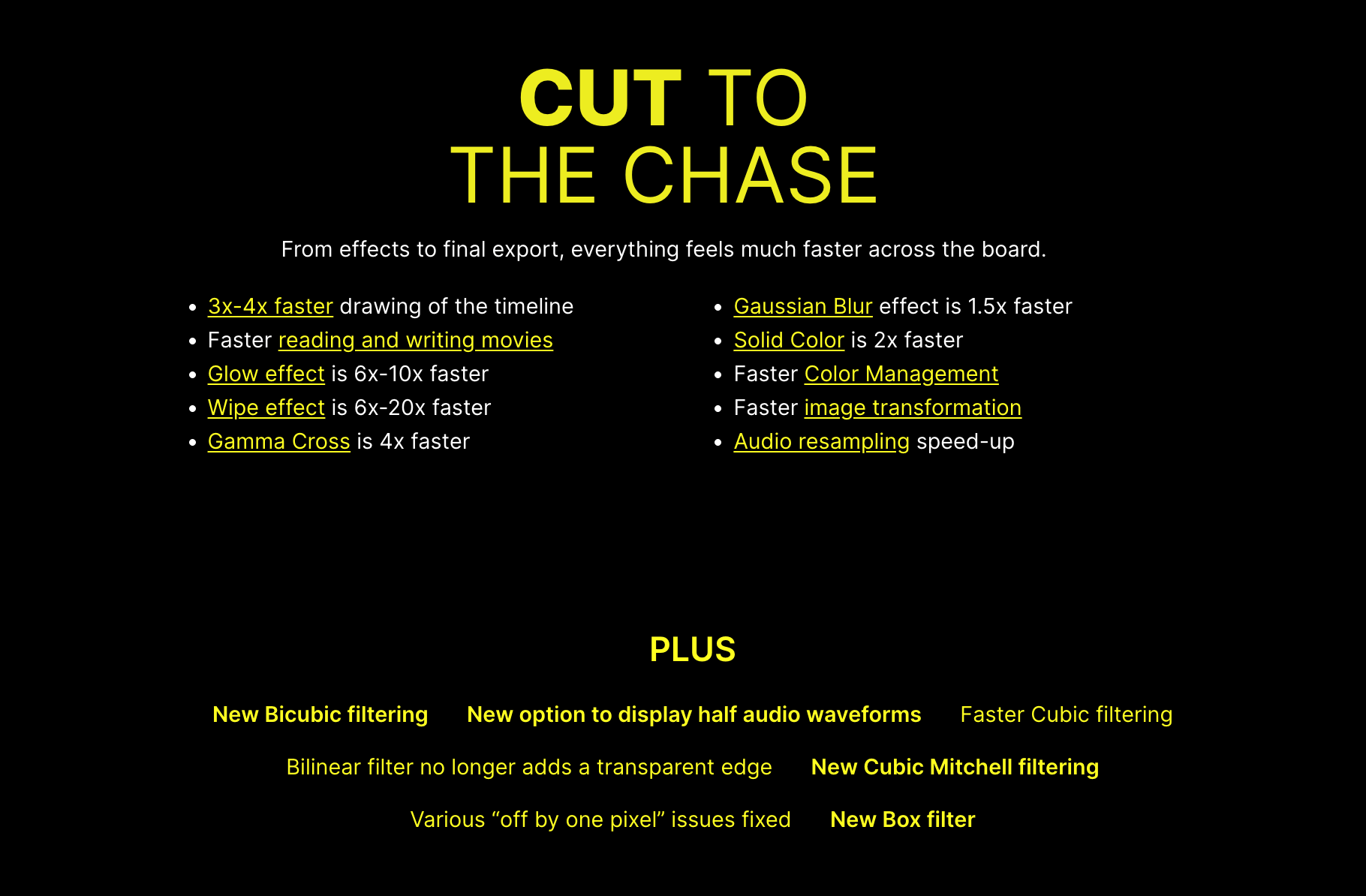 For upcoming year, we want to tackle three large items: 1) more compositor node-based things (modifiers, effects, transitions) including more performance to them, 2) hardware acceleration for video decoding/encoding, 3) workflows like media bins, media preview, three point editing. That and more “wishlist” type of items is detailed in this devtalk thread.