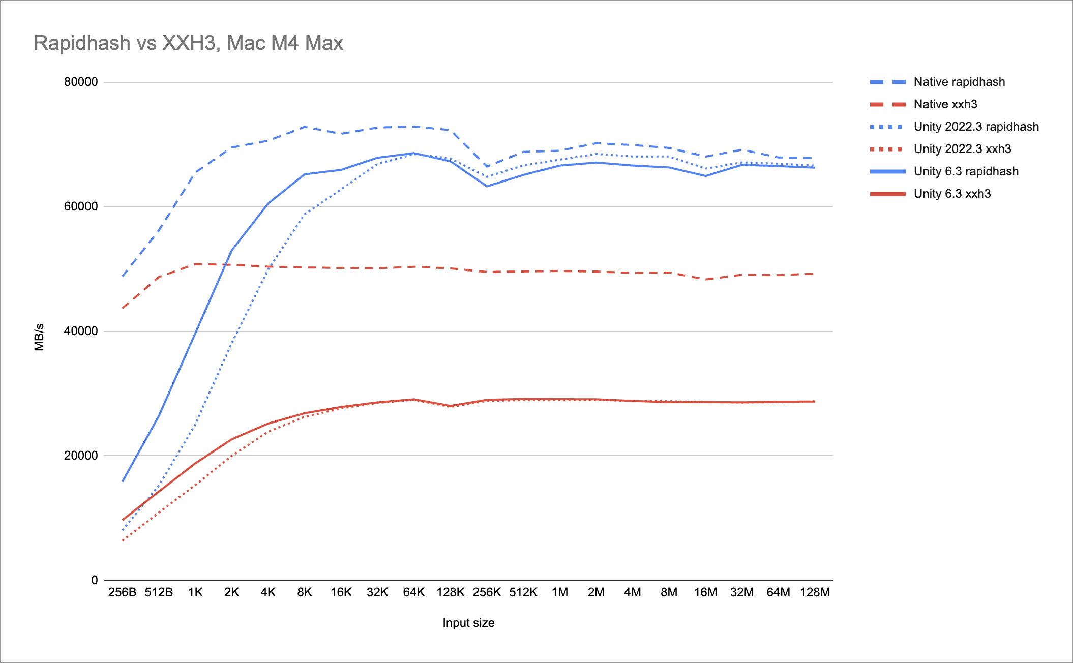 Apple M4 Max / macOS / Xcode 16.1: rapidhash reaches 67GB/s. Native XXH3 version reaches 50GB/s, and C#/Burst